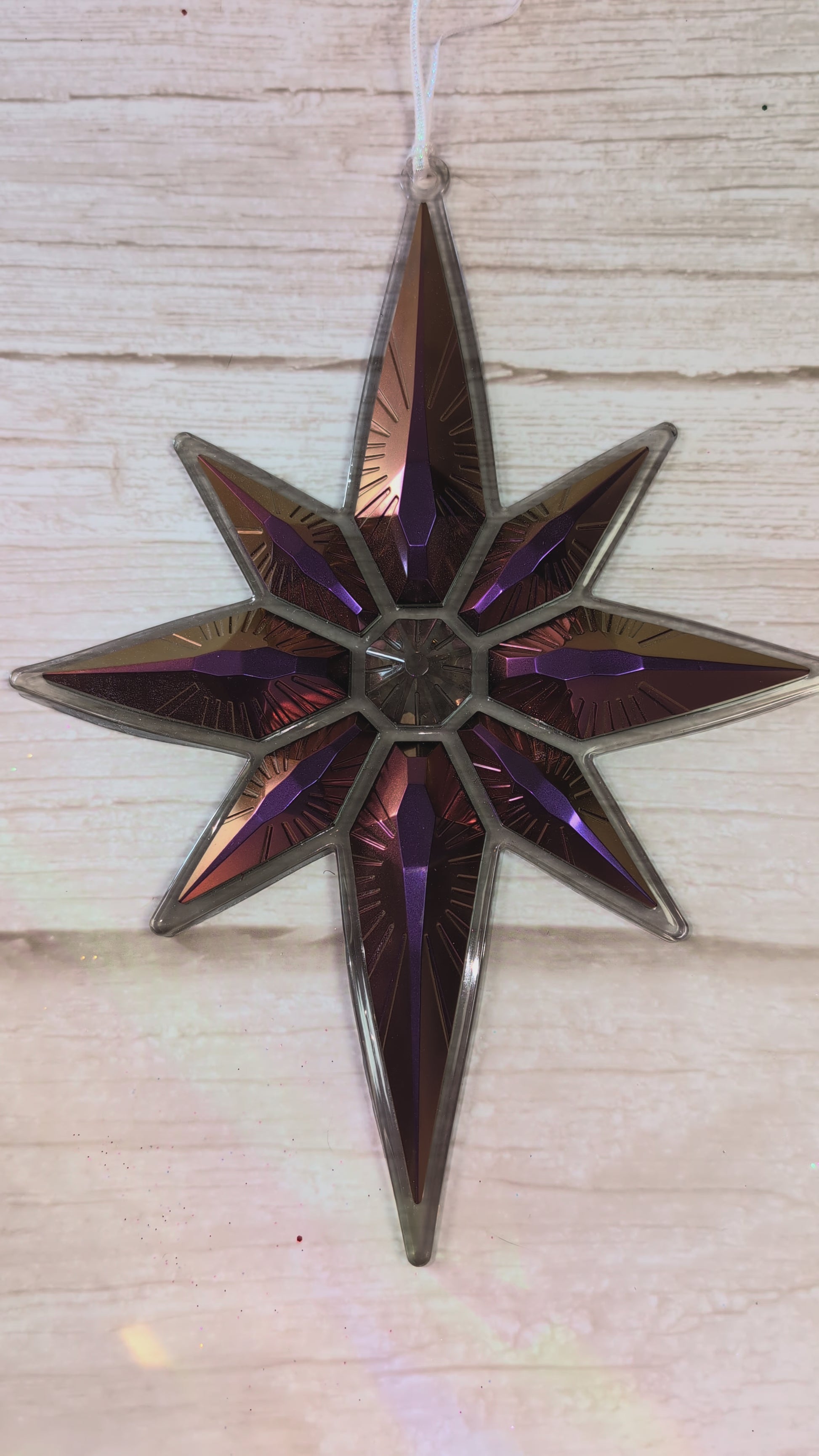 A bold, shimmering star designed to catch the light from every angle. This handmade resin ornament features a dramatic purple–copper chameleon shift with crisp geometric detail. Lightweight, durable, and ready to hang — perfect for Christmas trees, decorative garlands, or adding a little celestial drama to your home.