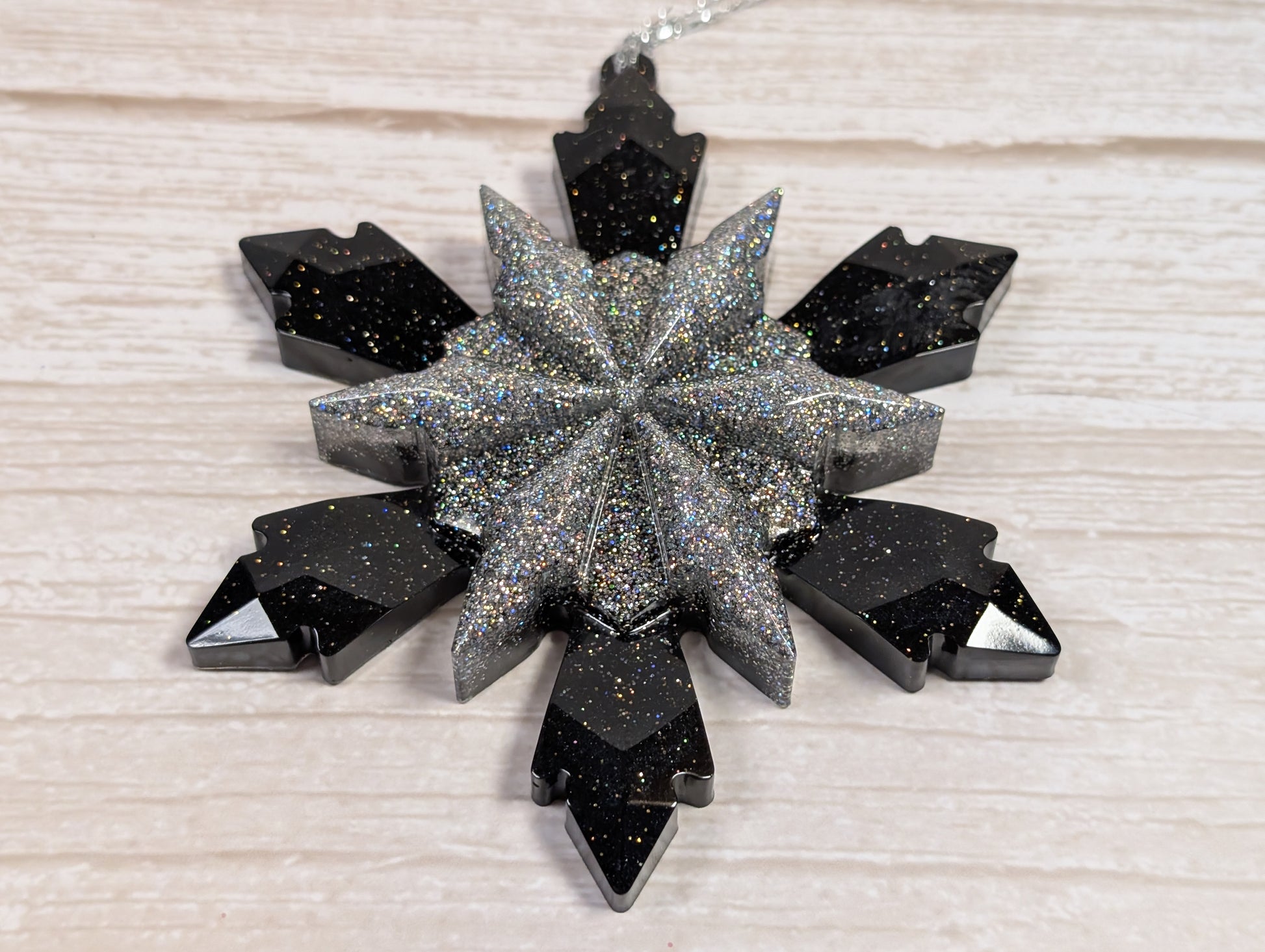This snowflake is made by hand in small batches using clear epoxy resin and high quality pigments. Every one comes out slightly different, which means the one you choose is genuinely one of a kind. The design is a solid three dimensional shape with raised faceted details that catch the light beautifully. It works well on Christmas trees, winter branches, garlands, and gift wrapping, and can be displayed long after the festive season.