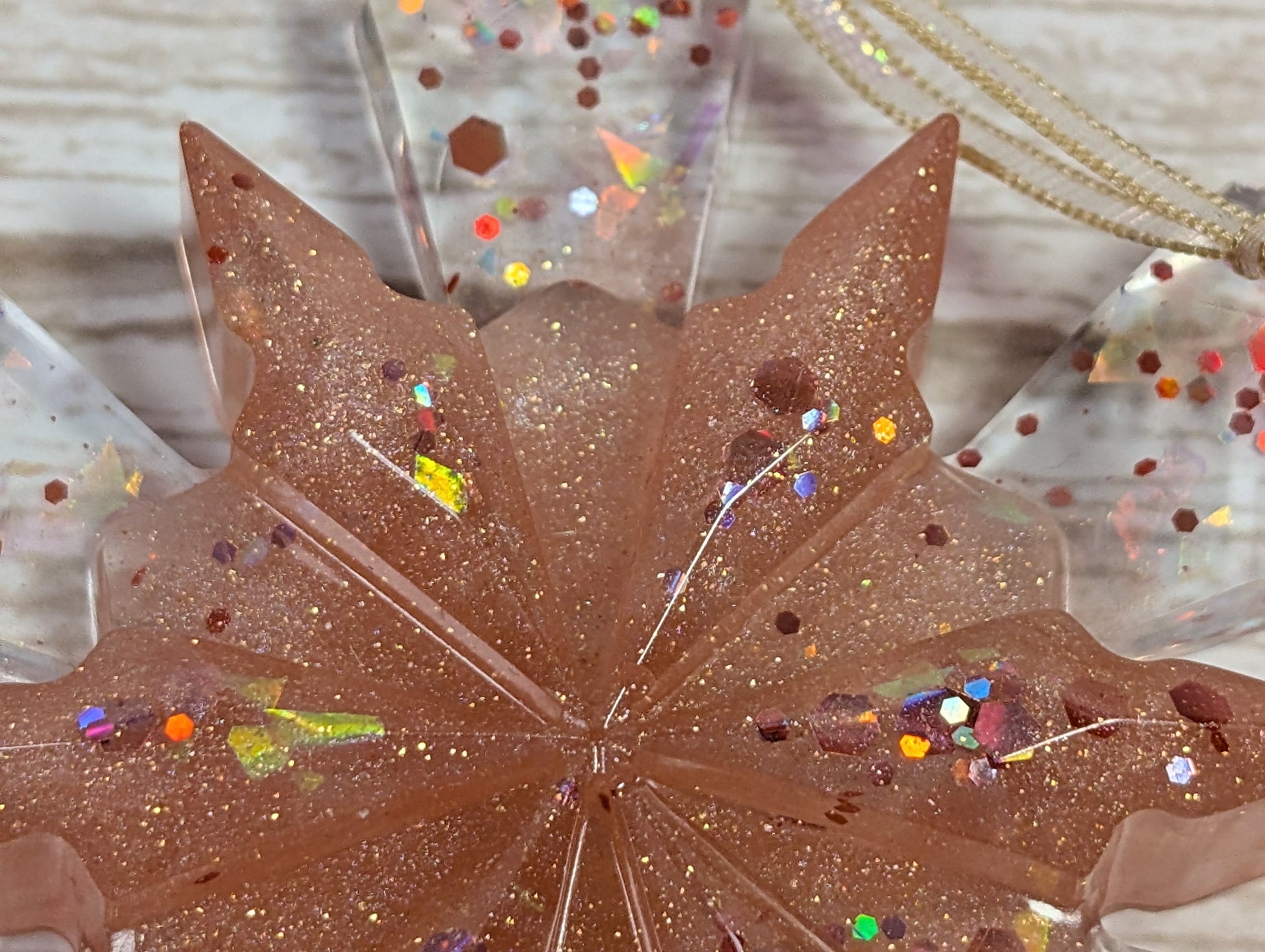 Each ornament is poured in two layers so the centre and outer points have depth and variation. Some have soft shimmering mica, some have bold glitter, and some are completely clear with colour suspended inside. The resin cures to a glossy finish and feels weighty and smooth in the hand. Colours and patterns vary with each piece and the piece you receive may vary slightly from the photo.